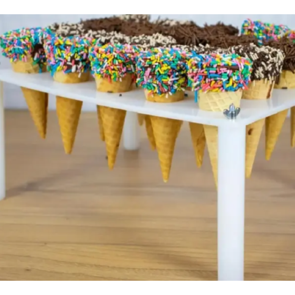 SUPORTE PARA CONE 24,5CM X 29,5CM – ALTURA 13CM. CONTÉM 5 PEÇAS (1 PLACA BASE + 4 PÉS DE SUSTENTAÇÃO). IDEAL PARA EXPOR E SERVIR CONES DE DOCES, SALGADOS OU SORVETES EM FESTAS, EVENTOS E BUFFETS. ESTRUTURA ESTÁVEL E FÁCIL DE MONTAR, TRAZ PRATICIDADE E ELEGÂNCIA À APRESENTAÇÃO DOS ALIMENTOS.