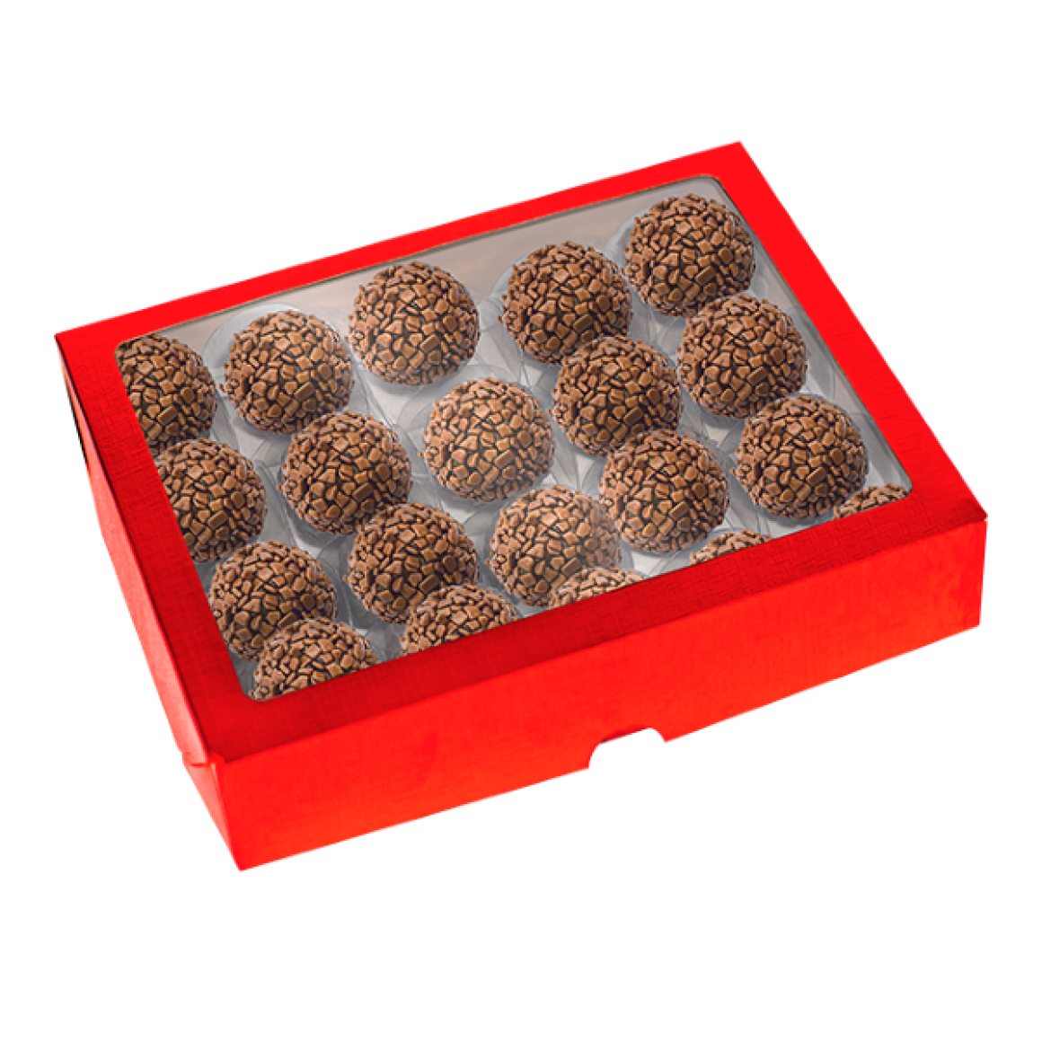 CAIXA LAMINADA VERMELHA COM VISOR TRANSPARENTE PARA 20 DOCES, IDEAL PARA EMBALAR BRIGADEIROS, TRUFAS, BOMBONS E OUTROS DOCES FINOS. FABRICADA EM PAPEL CARTÃO DE ALTA QUALIDADE COM ACABAMENTO METALIZADO NA COR VERMELHA, OFERECE ELEGÂNCIA, RESISTÊNCIA E BELEZA NA APRESENTAÇÃO DOS DOCES. O VISOR FRONTAL PERMITE A VISUALIZAÇÃO DO CONTEÚDO SEM PRECISAR ABRIR A EMBALAGEM. PERFEITA PARA PRESENTES, LEMBRANCINHAS, EVENTOS, FESTAS E DATAS COMEMORATIVAS COMO DIA DOS NAMORADOS E NATAL.
