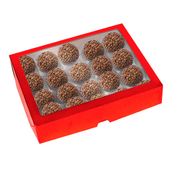 CAIXA LAMINADA VERMELHA COM VISOR TRANSPARENTE PARA 20 DOCES, IDEAL PARA EMBALAR BRIGADEIROS, TRUFAS, BOMBONS E OUTROS DOCES FINOS. FABRICADA EM PAPEL CARTÃO DE ALTA QUALIDADE COM ACABAMENTO METALIZADO NA COR VERMELHA, OFERECE ELEGÂNCIA, RESISTÊNCIA E BELEZA NA APRESENTAÇÃO DOS DOCES. O VISOR FRONTAL PERMITE A VISUALIZAÇÃO DO CONTEÚDO SEM PRECISAR ABRIR A EMBALAGEM. PERFEITA PARA PRESENTES, LEMBRANCINHAS, EVENTOS, FESTAS E DATAS COMEMORATIVAS COMO DIA DOS NAMORADOS E NATAL.